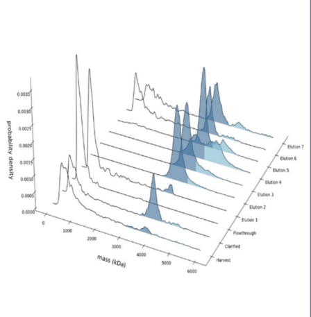 除用于純化樣品的快速表征外,SamuxMP還可用于過(guò)程樣品分析,加速AAV載體工藝開(kāi)發(fā)流程。根據(jù)分子質(zhì)量的不同,SamuxMP可以快速洞察不同過(guò)程樣品中雜質(zhì)、目標(biāo)產(chǎn)物、聚集體的狀態(tài),及時(shí)對(duì)生產(chǎn)工藝做出準(zhǔn)確評(píng)估。圖中展示了從樣品收獲,澄清以及不同洗脫流程收集樣品的測(cè)試結(jié)果,可見(jiàn)在第四次洗脫后收集到最富足的目標(biāo)產(chǎn)物(最少的雜質(zhì)比例以及最高的實(shí)心AAV比例)