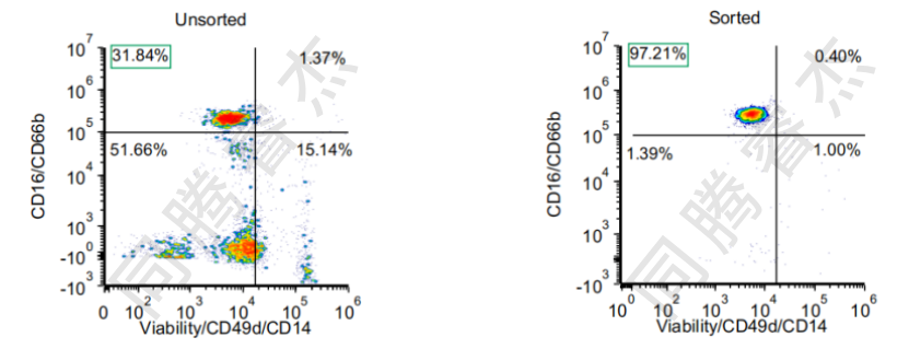 全血細胞經染色后分析,檢測中性粒細胞陰性標記物CD49d和CD14,以及中性粒細胞陽性標記物CD16和CD66b。通過SytoxGreen細胞活力染料排除死亡細胞后分選,活中性粒細胞純度從31.84%(下圖左)提升至97.21%(下圖右),增幅超過三倍。