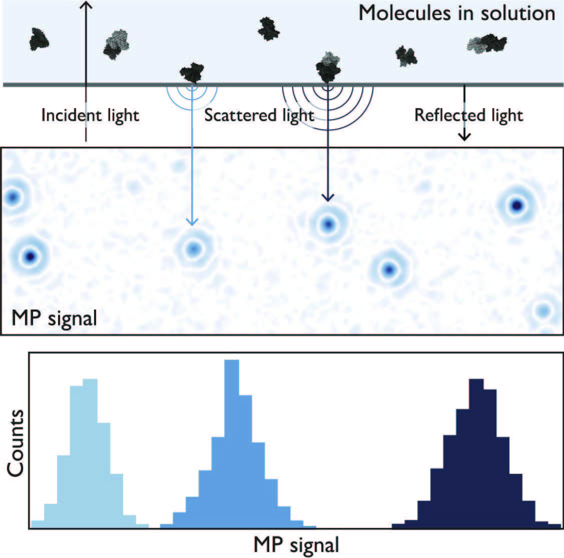 質量光度法(Mass photometry ,MP )是基于干涉反射顯微鏡和干涉散射顯微鏡2原理的一種分析表征技術。MP技術誕生于牛津大學Kukura教授實驗室,Kukura團隊通過精巧地控制照明和探測光路,使用新穎的空間濾波裝置以及強大的分析工具,成功探測到單分子的微量散射信號,