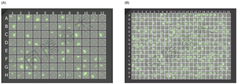 使用WOLF將GFP陽性的HEK293T細胞分選至96和384孔板中年,隨后將分選后的細胞置于37℃、5% CO?的培養箱中靜置培養。第14天使用成像系統進行拍照,并計數GFP陽性克隆(下圖)。